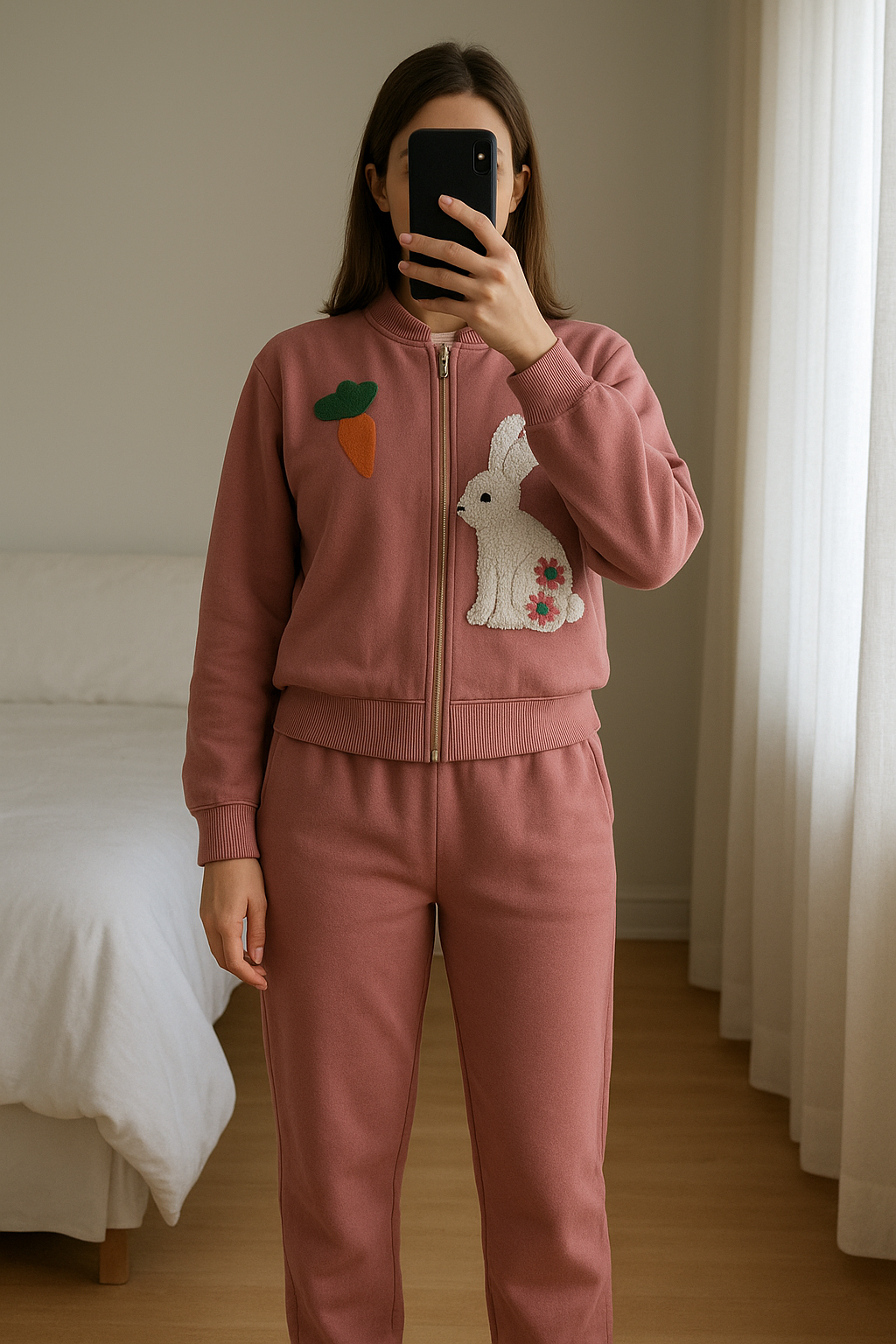 Ensemble Survêtement lapin osay debout, face à la caméra, dans une chambre à la lumière douce, avec une lumière naturelle filtrant par la fenêtre.