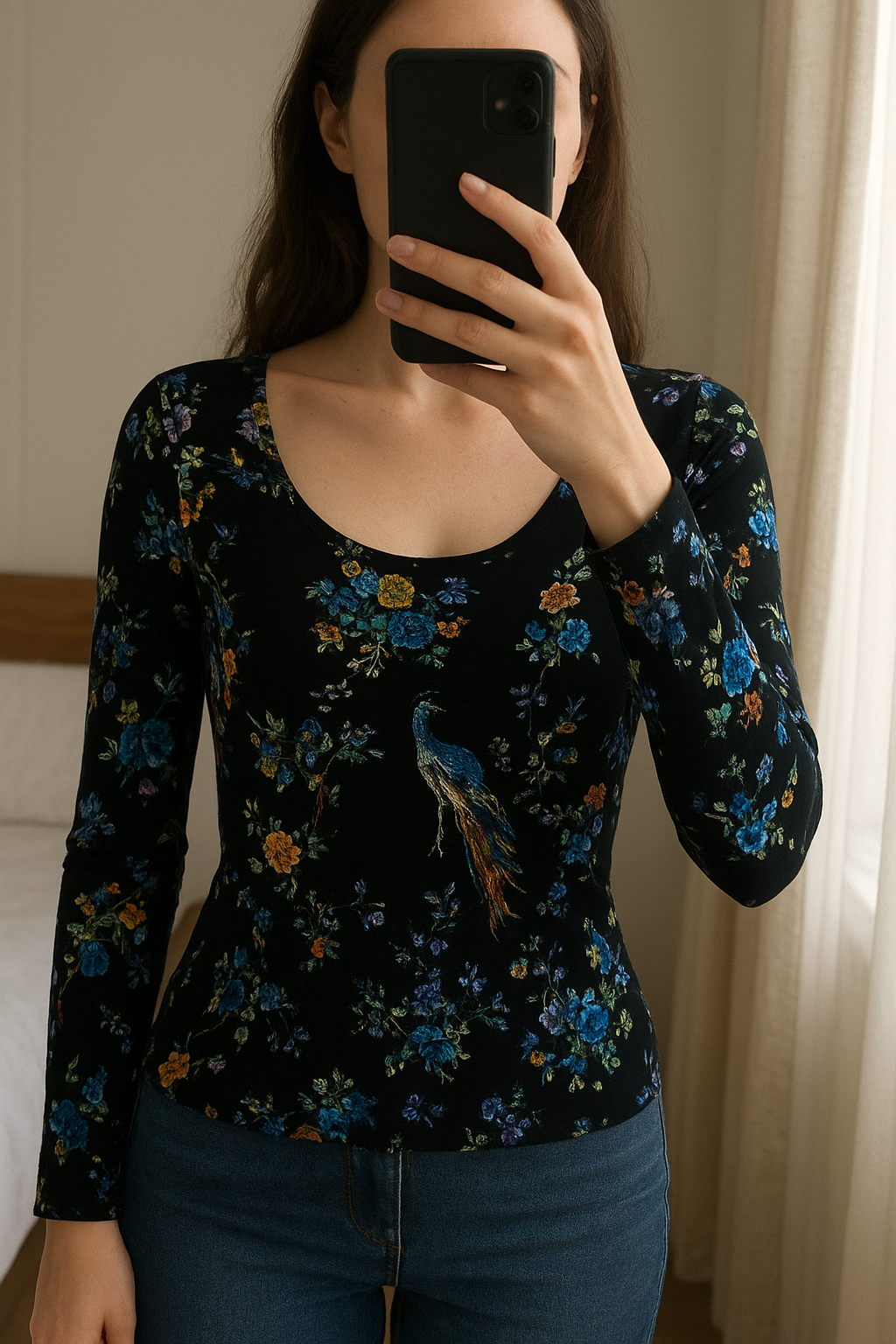 Esclusiva T-Shirt Maniche Lunghe Just Cavalli - Fantasia Esotica e Floreale! in piedi, rivolto verso la fotocamera, in una camera da letto con luce soffusa e luce naturale che filtra dalla finestra.