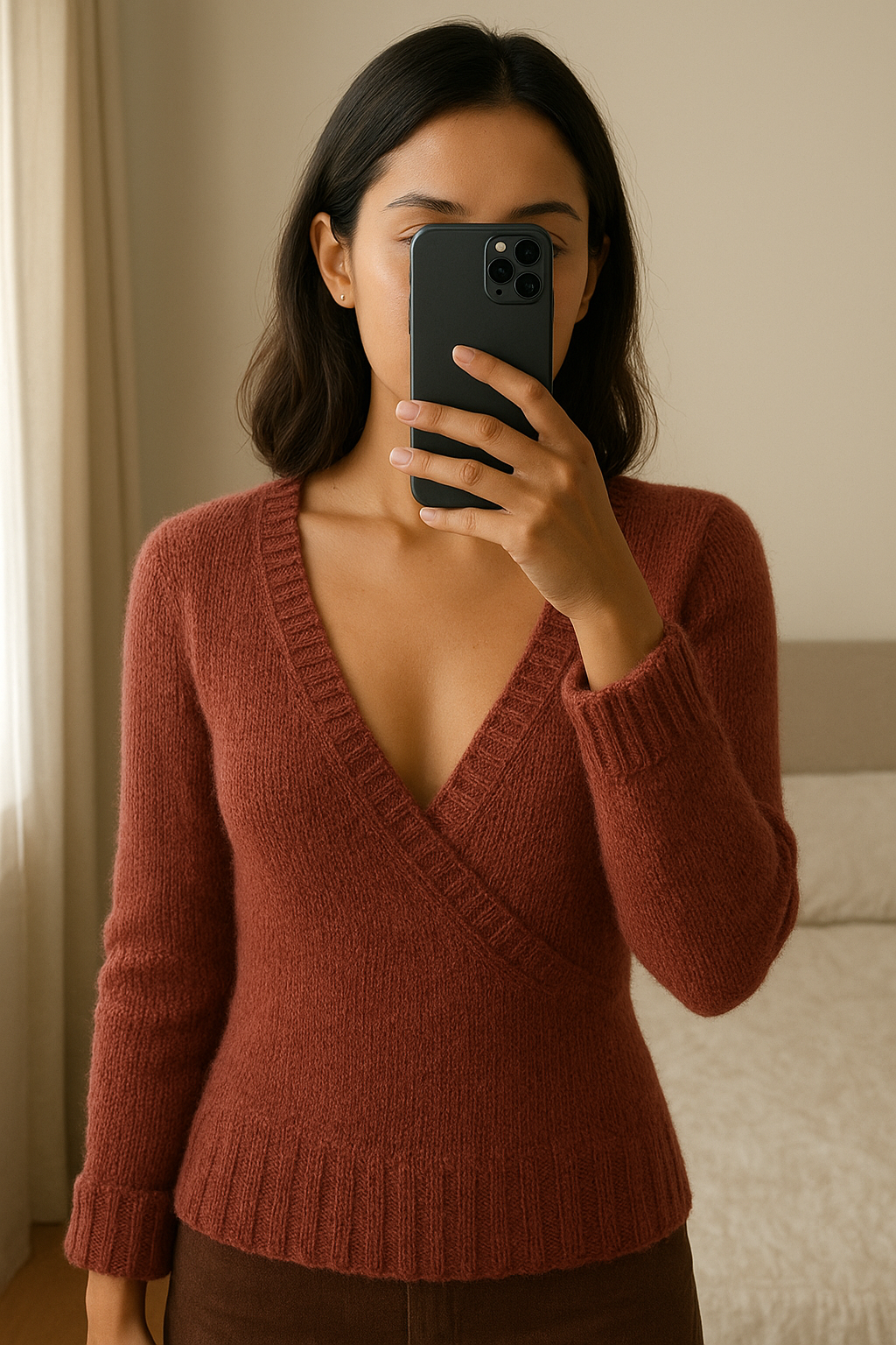 Une personne en Essentiel M - Pull cache-cœur bordeaux laine douce manches longues debout, face à la caméra, dans une chambre à la lumière douce, avec une lumière naturelle filtrant par la fenêtre.