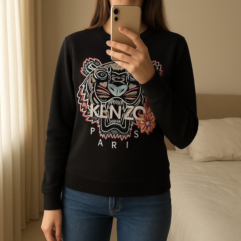 Felpa nera Kenzo in piedi, rivolto verso la fotocamera, in una camera da letto con luce soffusa e luce naturale che filtra dalla finestra.