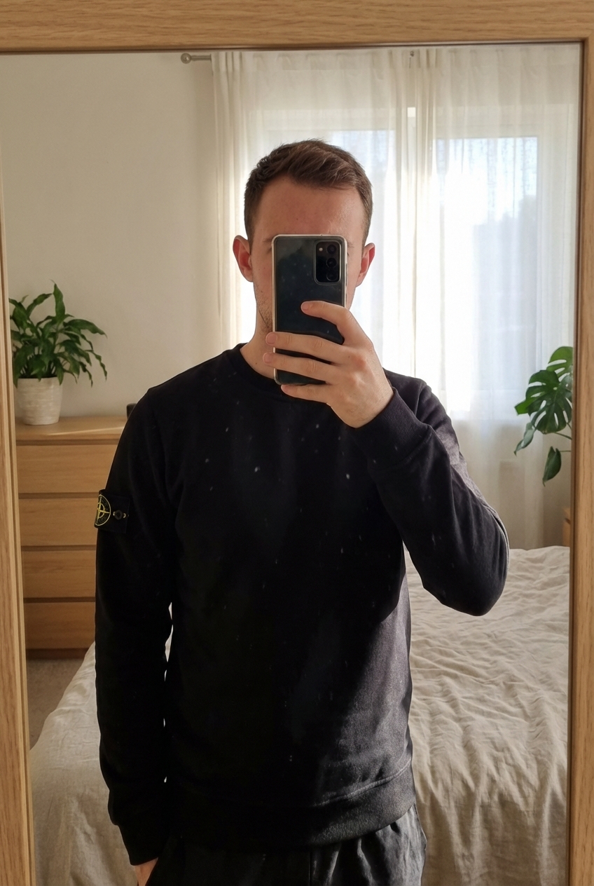 Felpa nera Stone island uomo,tg m nuova girocollo,calda e con logo sul braccio sinistro in piedi, rivolto verso la fotocamera, in una camera da letto con luce soffusa e luce naturale che filtra dalla finestra.