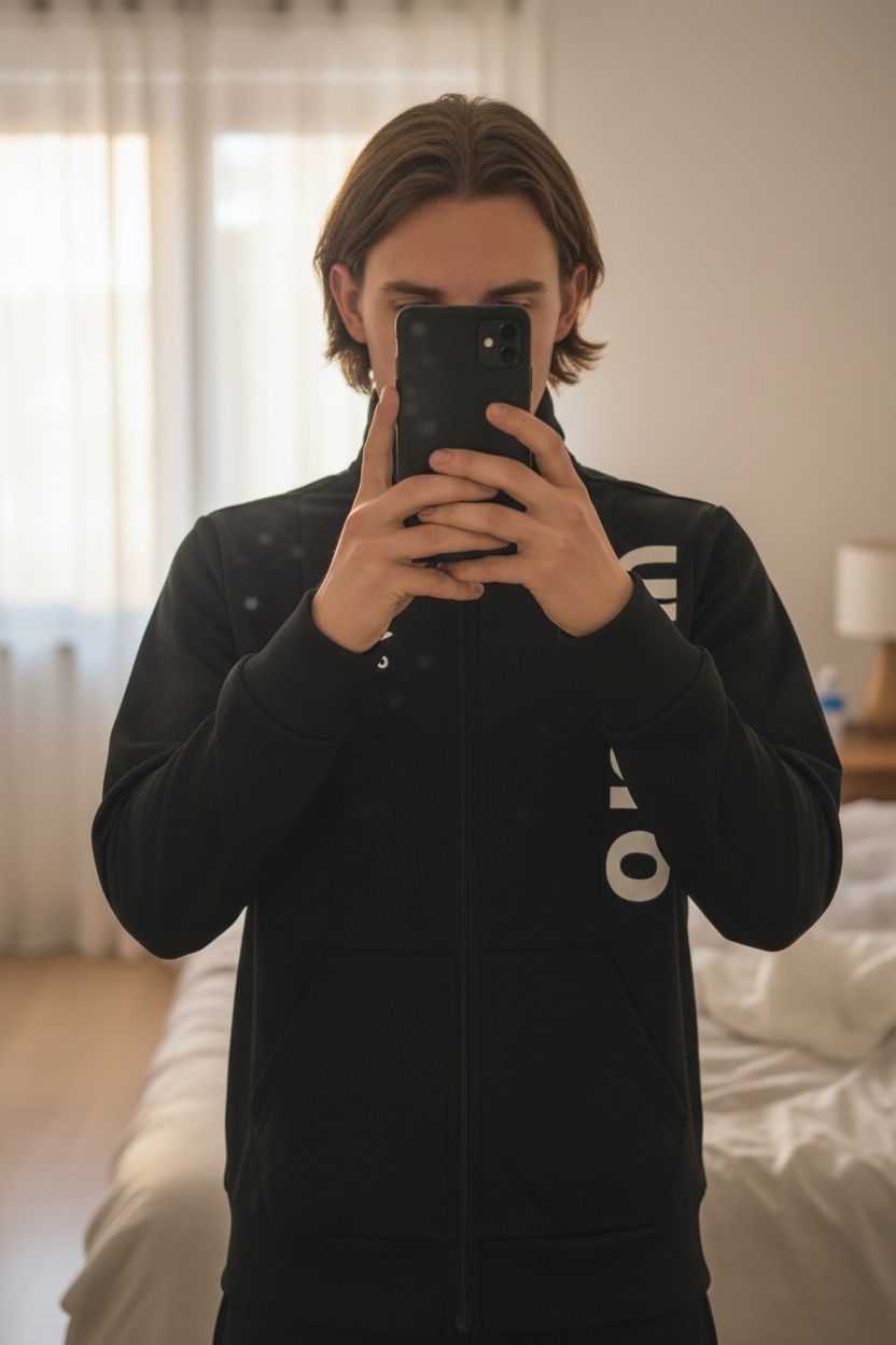 Felpa Umbro zip nera S unisex sportiva streetwear originale ottime condizioni in piedi, rivolto verso la fotocamera, in una camera da letto con luce soffusa e luce naturale che filtra dalla finestra.