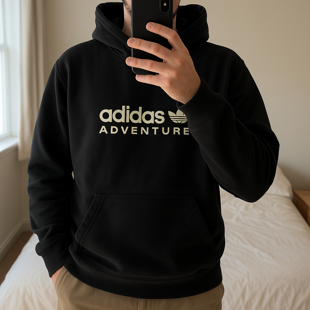 Felpe adidas Nero uomo - pull adidas homme S in piedi, rivolto verso la fotocamera, in una camera da letto con luce soffusa e luce naturale che filtra dalla finestra.