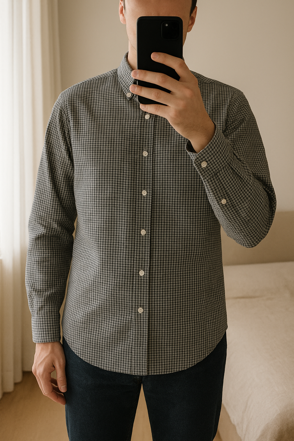 Geruit hemd - Celio - maat L - goede staat debout, face à la caméra, dans une chambre à la lumière douce, avec une lumière naturelle filtrant par la fenêtre.