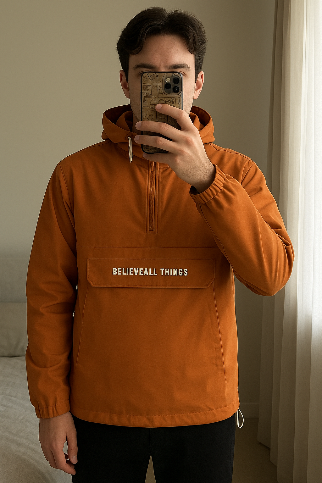 Giacca anti pioggia con scritta in piedi, rivolto verso la fotocamera, in una camera da letto con luce soffusa e luce naturale che filtra dalla finestra.