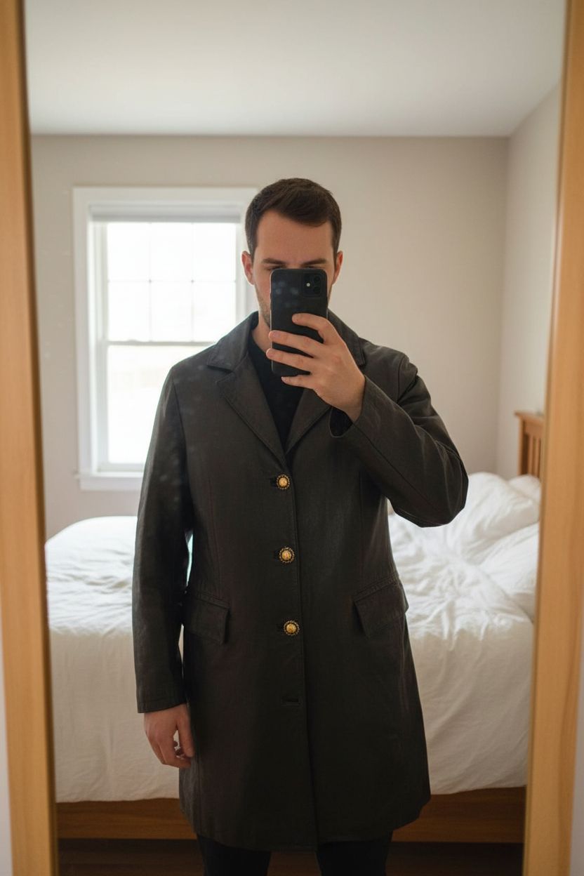 Giacca in vera pelle in piedi, rivolto verso la fotocamera, in una camera da letto con luce soffusa e luce naturale che filtra dalla finestra.