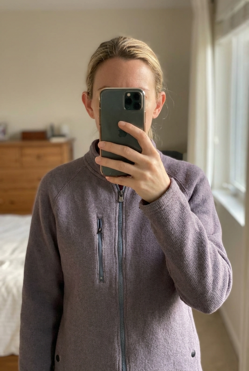 Giacchetta invernale con zip - Taglia M in piedi, rivolto verso la fotocamera, in una camera da letto con luce soffusa e luce naturale che filtra dalla finestra.