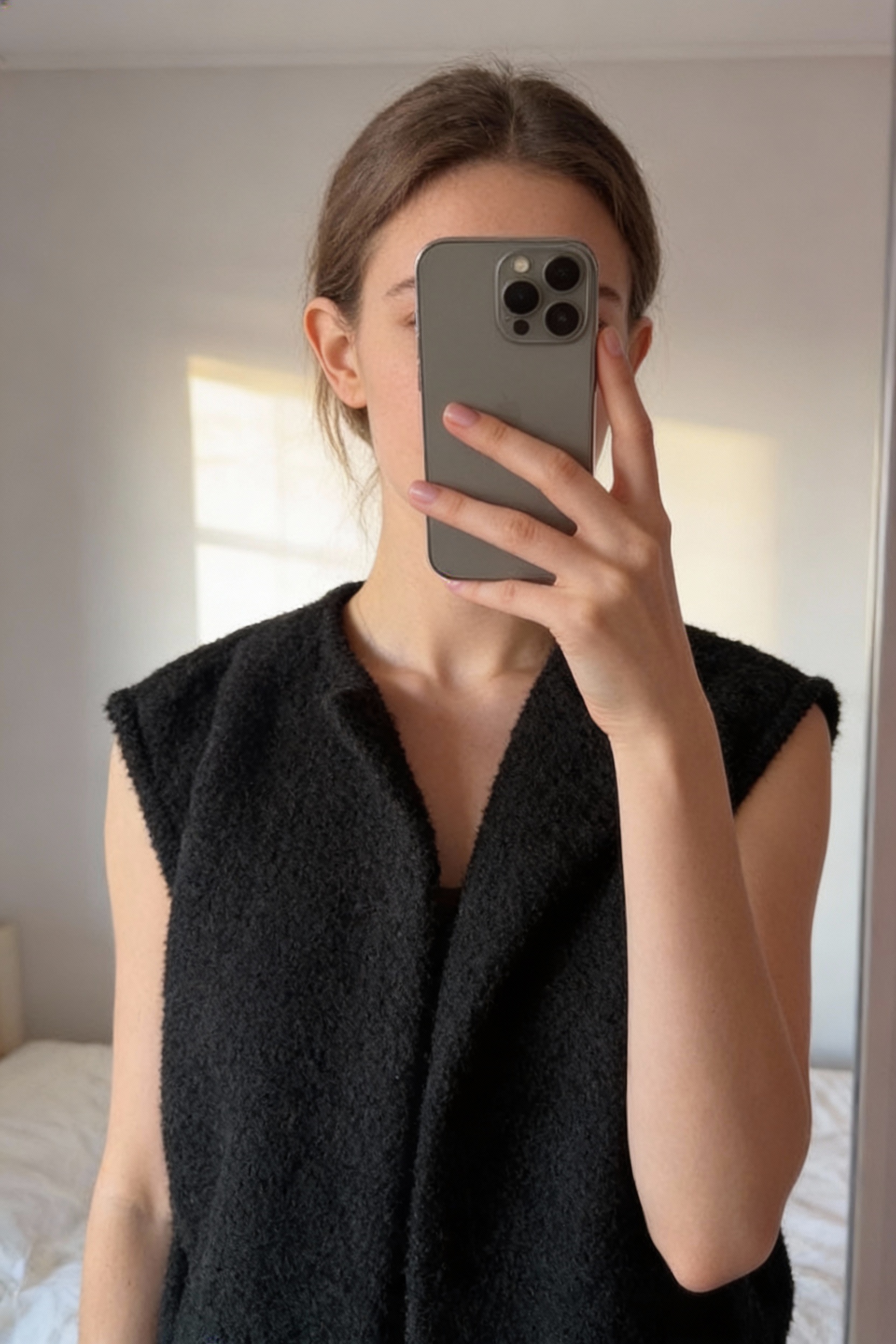 Una persona in Gilet cardigan noir M donna in piedi, rivolto verso la fotocamera, in una camera da letto con luce soffusa e luce naturale che filtra dalla finestra.