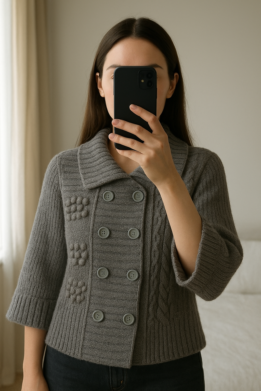 Gilet court debout, face à la caméra, dans une chambre à la lumière douce, avec une lumière naturelle filtrant par la fenêtre.