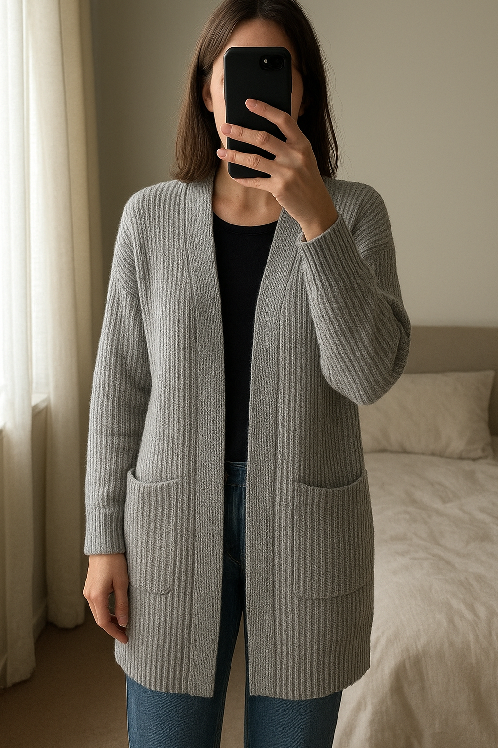 Gilet gris taille M debout, face à la caméra, dans une chambre à la lumière douce, avec une lumière naturelle filtrant par la fenêtre.
