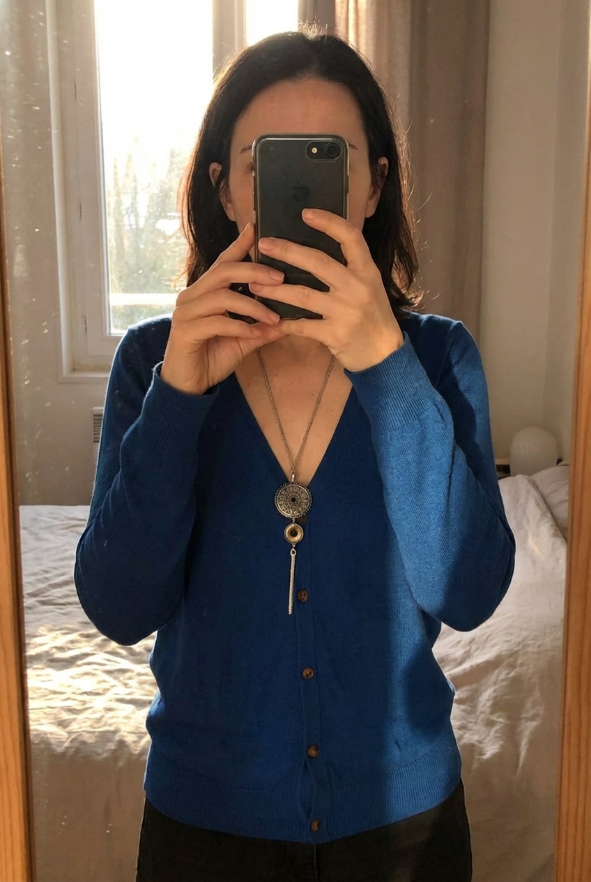 Gilet H&M T36 debout, face à la caméra, dans une chambre à la lumière douce, avec une lumière naturelle filtrant par la fenêtre.