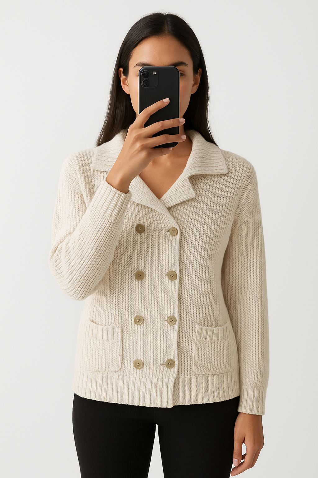 Une personne en Gilet laine blanc 1 2 3 debout, face à la caméra, avec une silhouette fine, dans un studio photo épuré avec fond blanc et éclairage doux.