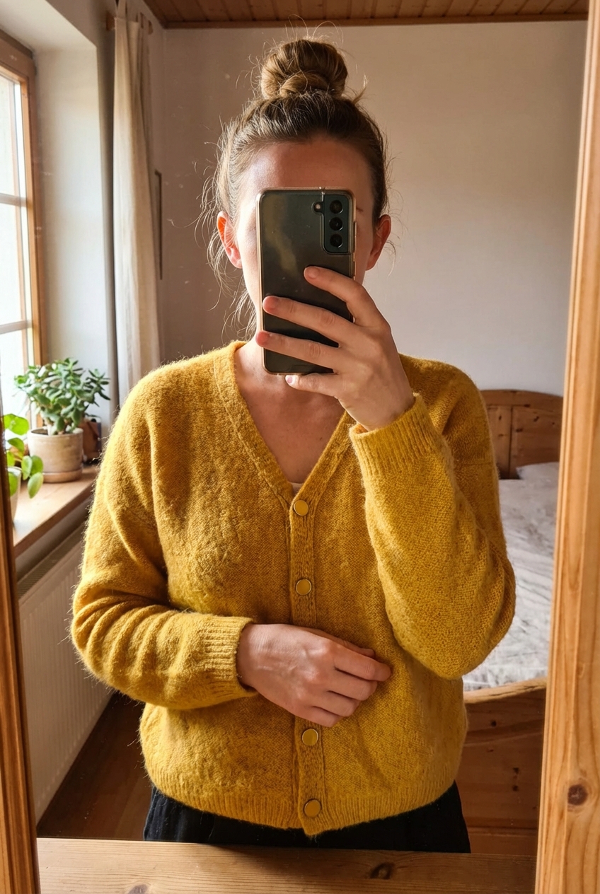 Gilet laine jaune soleil chaud et confortable debout, face à la caméra, dans une chambre à la lumière douce, avec une lumière naturelle filtrant par la fenêtre.
