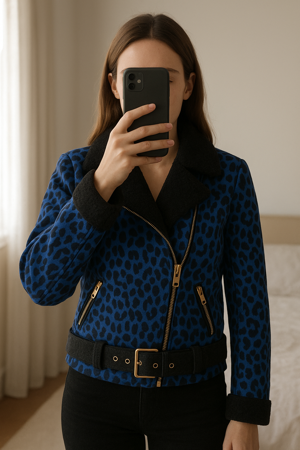 Giubbino maculato blu elettrico con pelliccia interna in piedi, rivolto verso la fotocamera, in una camera da letto con luce soffusa e luce naturale che filtra dalla finestra.