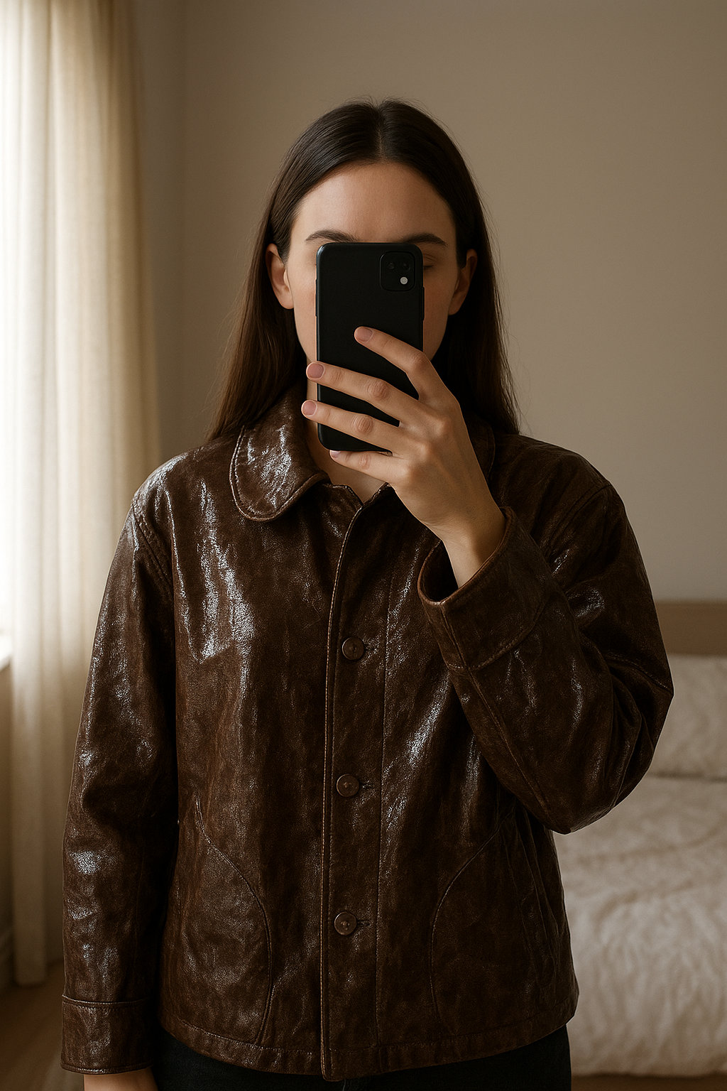 Giubbotto marrone effetto lucido in piedi, rivolto verso la fotocamera, in una camera da letto con luce soffusa e luce naturale che filtra dalla finestra.