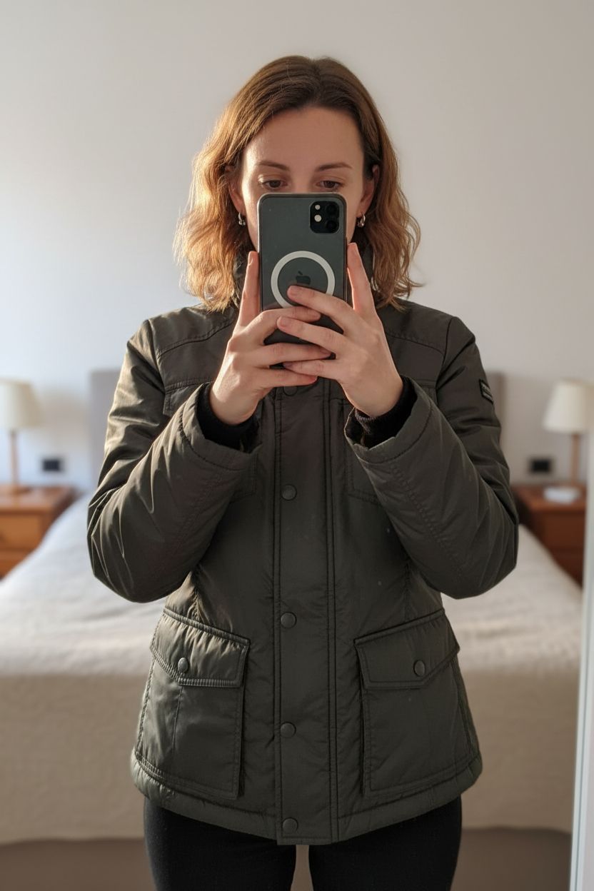 Giubbotto verde Conbipel donna M caldo inverno AFFARE in piedi, rivolto verso la fotocamera, in una camera da letto con luce soffusa e luce naturale che filtra dalla finestra.