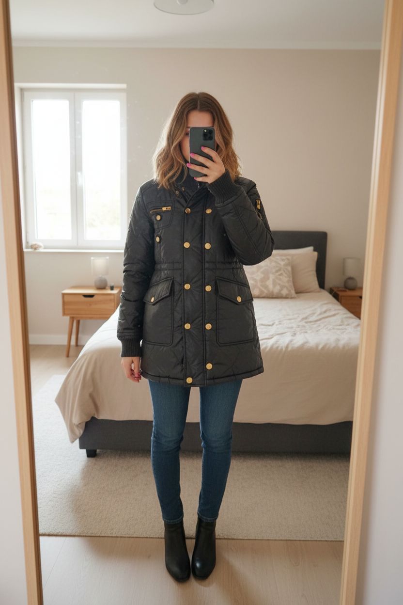 Giubotto donna vintage y2k taglia M in piedi, rivolto verso la fotocamera, in una camera da letto con luce soffusa e luce naturale che filtra dalla finestra.