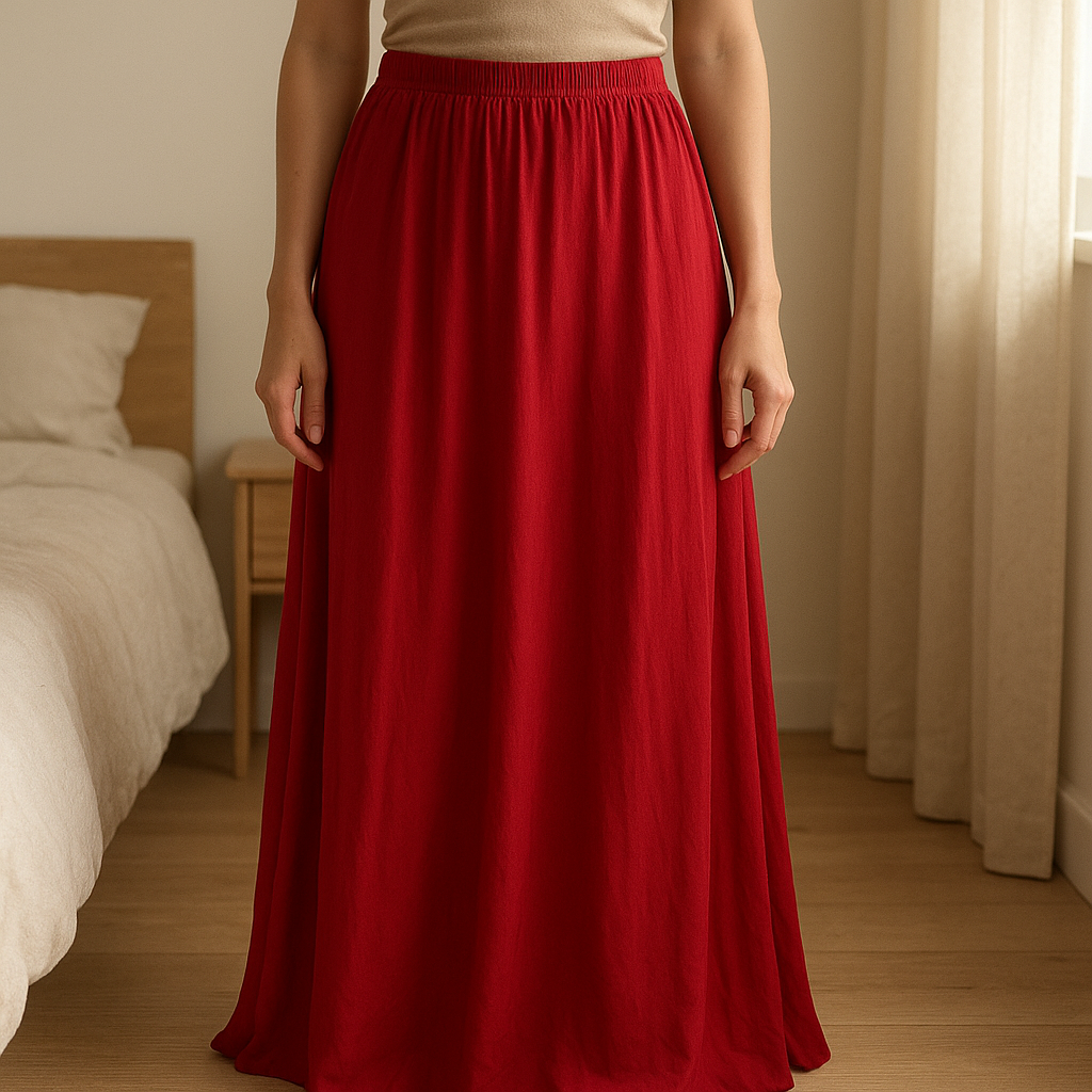 Gonna Midi satin in piedi, rivolto verso la fotocamera, in una camera da letto con luce soffusa e luce naturale che filtra dalla finestra.