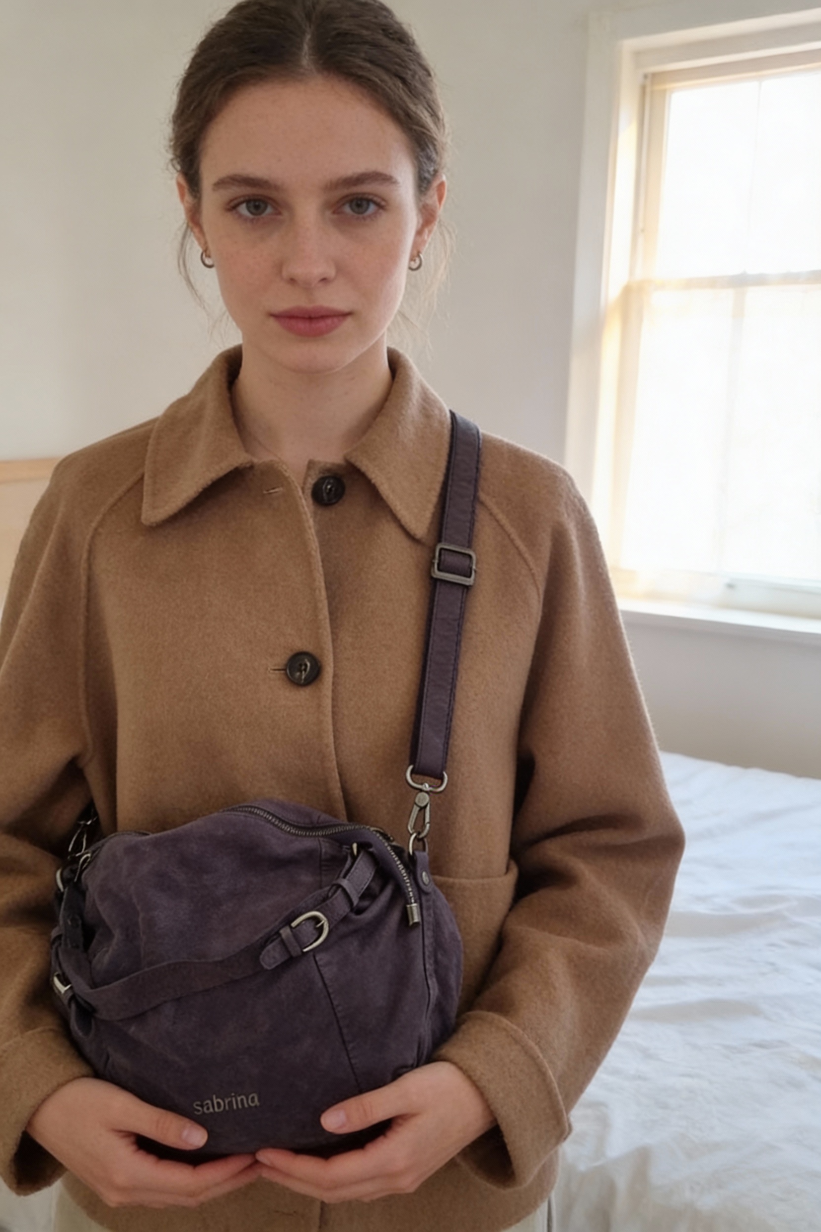 Grand sac bandoulière cuir Véritable Sabrina mauve debout, face à la caméra, dans une chambre à la lumière douce, avec une lumière naturelle filtrant par la fenêtre.