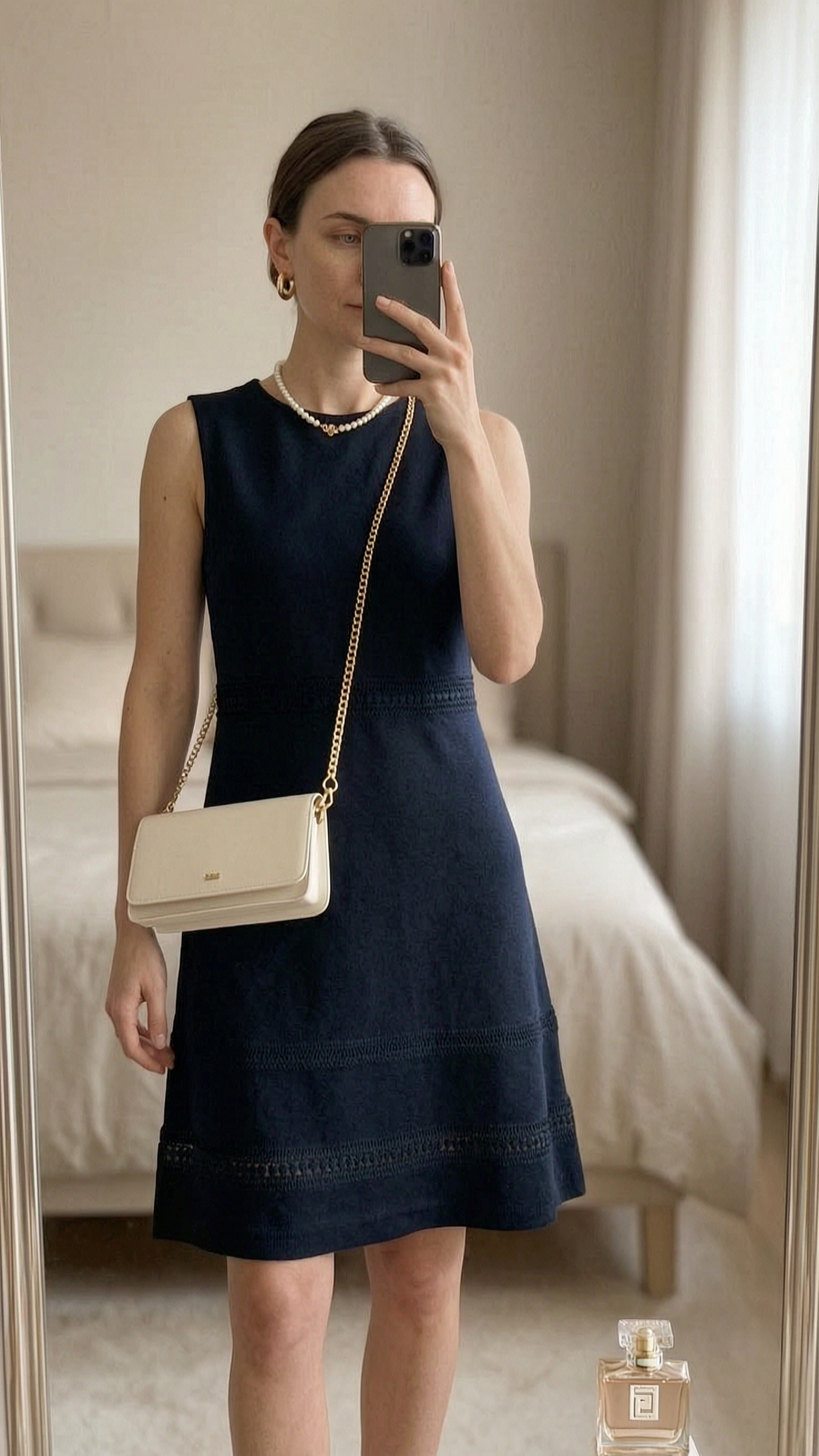 H&M: abito elegante blu notte per eventi formali stile Old Money 🖤 in piedi, rivolto verso la fotocamera, in una camera da letto con luce soffusa e luce naturale che filtra dalla finestra.