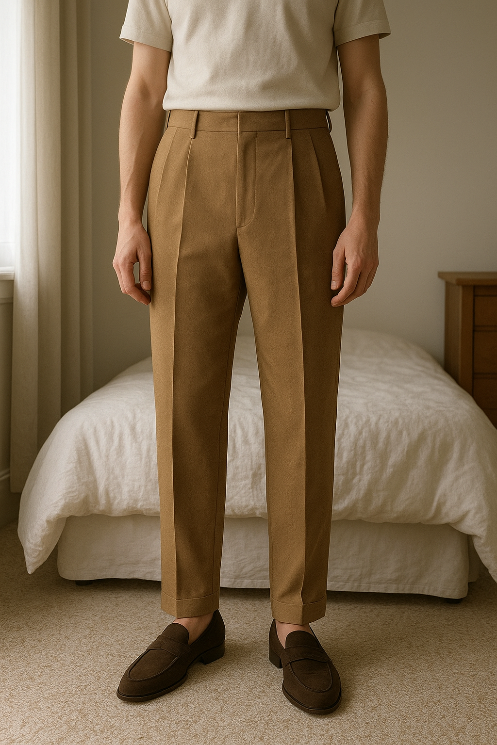 H&M kosztüm nadrág standing straight facing the camera, in a softly lit bedroom setting, with gentle natural light filtering through a window.