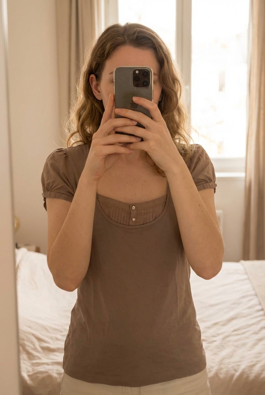 Haut Caroll à manches courtes debout, face à la caméra, dans une chambre à la lumière douce, avec une lumière naturelle filtrant par la fenêtre.
