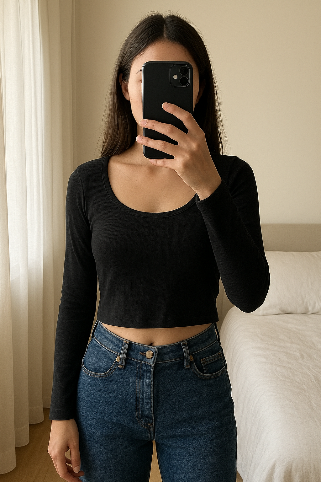 Haut noir côtelé à manches longues – Bizzbee debout, face à la caméra, dans une chambre à la lumière douce, avec une lumière naturelle filtrant par la fenêtre.