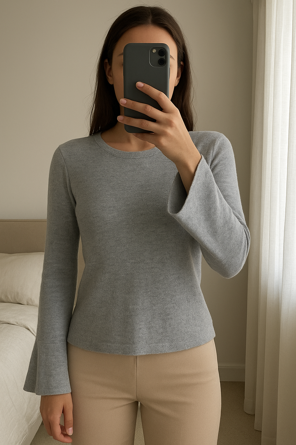 Haut Original Manches Trompette Gris- T38/40 debout, face à la caméra, dans une chambre à la lumière douce, avec une lumière naturelle filtrant par la fenêtre.