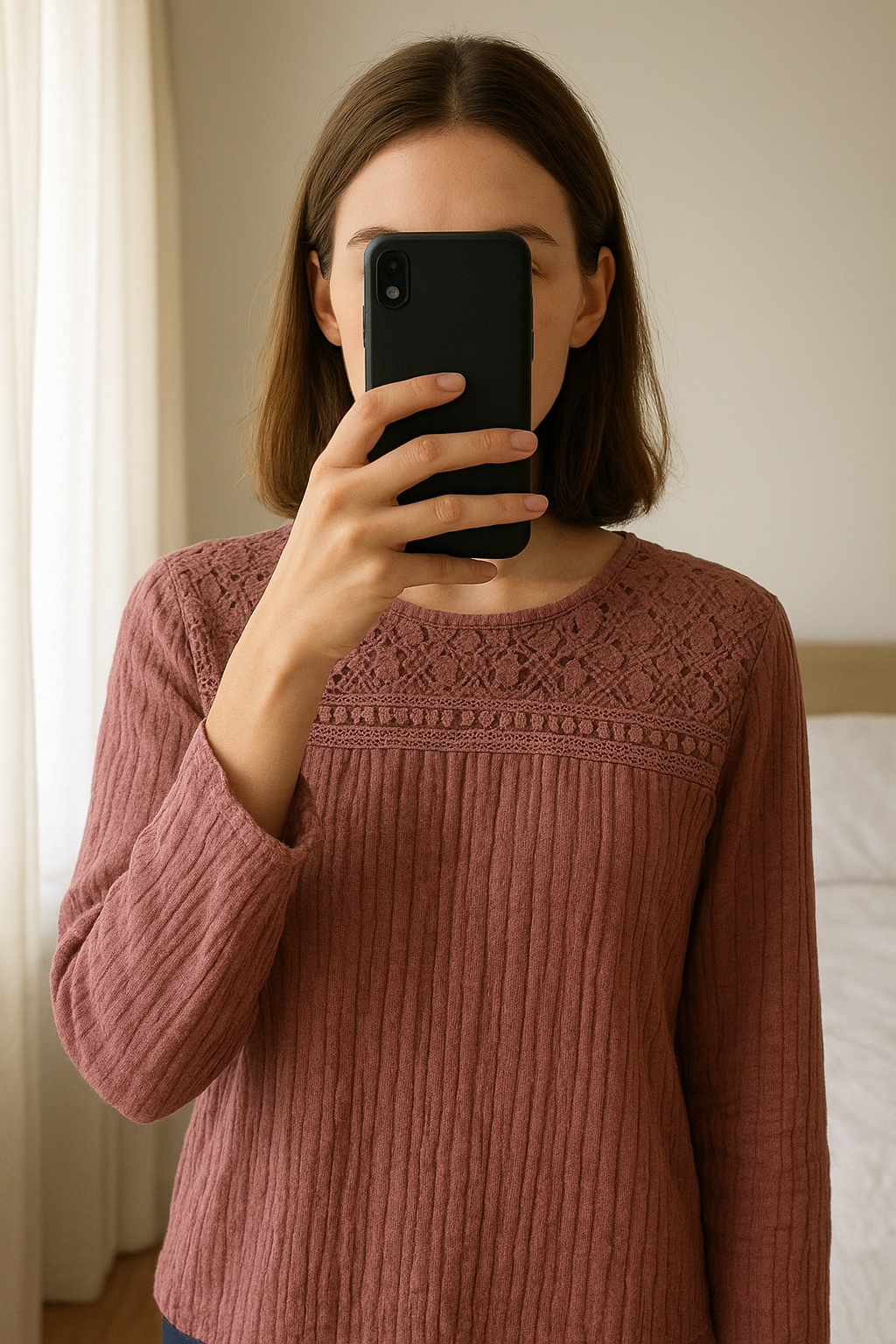 Haut vieux rose texturé avec dentelle – manches longues – Taille L debout, face à la caméra, dans une chambre à la lumière douce, avec une lumière naturelle filtrant par la fenêtre.
