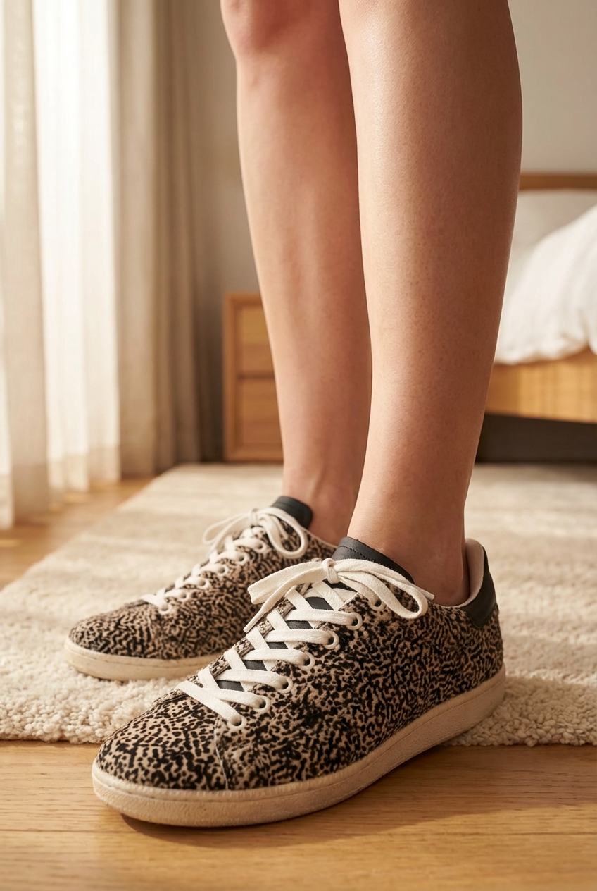 Une personne en Isabel Marant sneakers femme debout, face à la caméra, avec une silhouette fine, dans une chambre à la lumière douce, avec une lumière naturelle filtrant par la fenêtre.