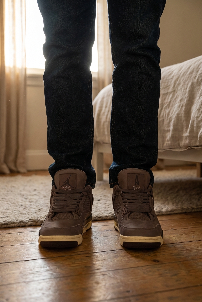 J4 a ma manière debout, face à la caméra, dans une chambre à la lumière douce, avec une lumière naturelle filtrant par la fenêtre.