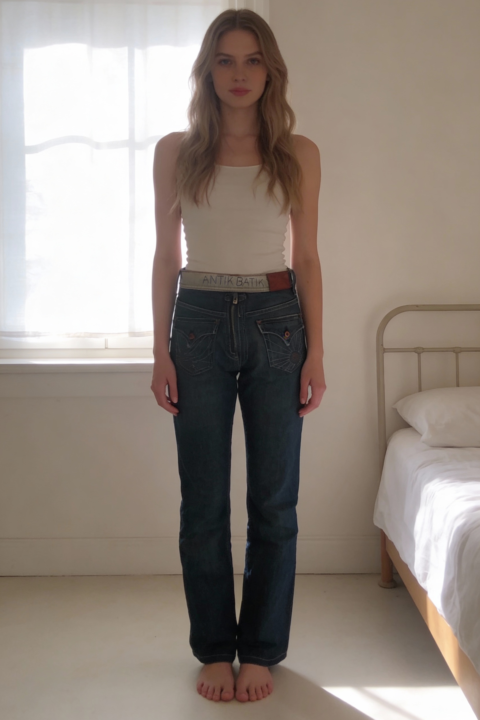 Jean Antik Batik neuf S 27 debout, face à la caméra, dans une chambre à la lumière douce, avec une lumière naturelle filtrant par la fenêtre.