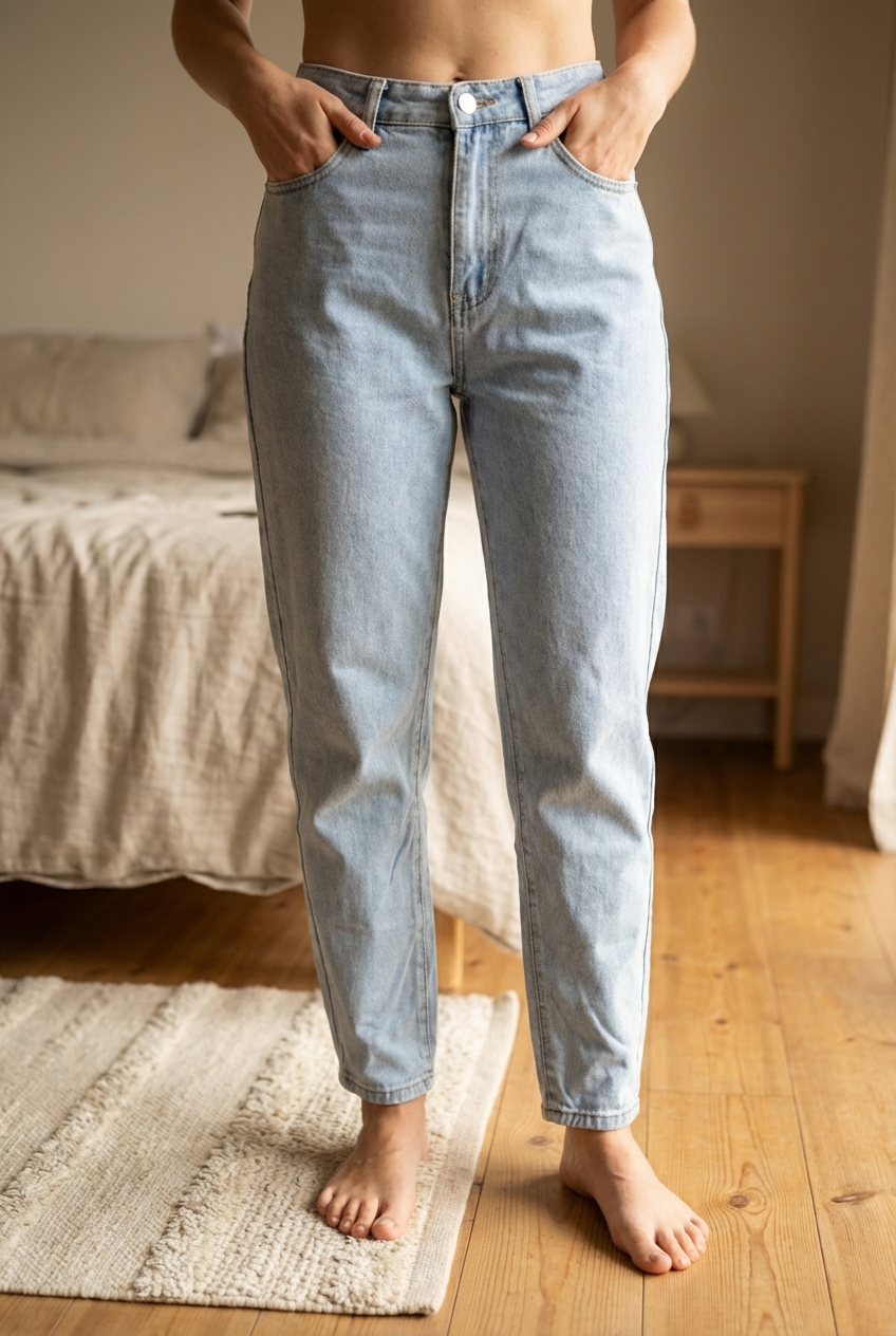 Jean clair coupe droite debout, face à la caméra, dans une chambre à la lumière douce, avec une lumière naturelle filtrant par la fenêtre.