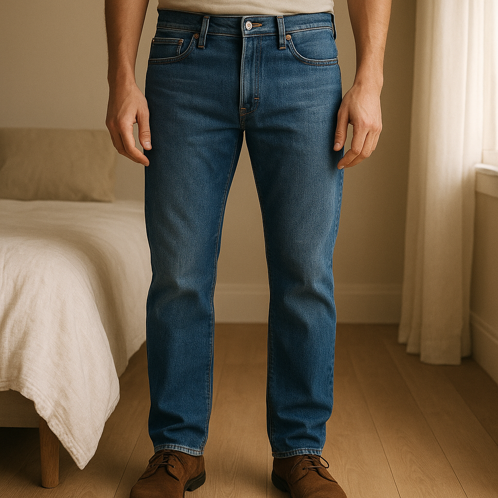 Jean Levi’s Homme – 511 Slim – Taille W33 L32 / FR42 – 100% Coton – White Oak Made in USA | J54 debout, face à la caméra, dans une chambre à la lumière douce, avec une lumière naturelle filtrant par la fenêtre.