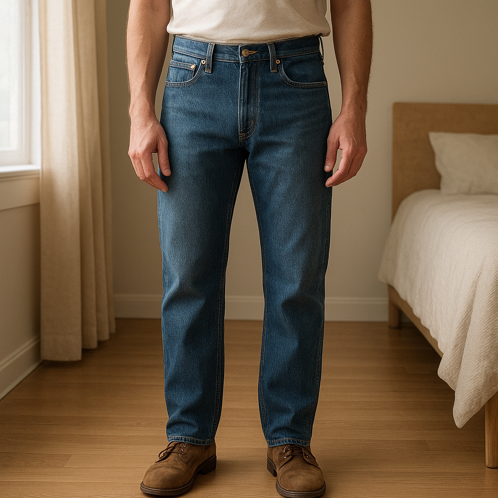 Jean Levi’s Homme – 513 Slim Straight – Taille W34 L32 / FR44 – 100% Coton – Bleu Denim | J52 debout, face à la caméra, dans une chambre à la lumière douce, avec une lumière naturelle filtrant par la fenêtre.