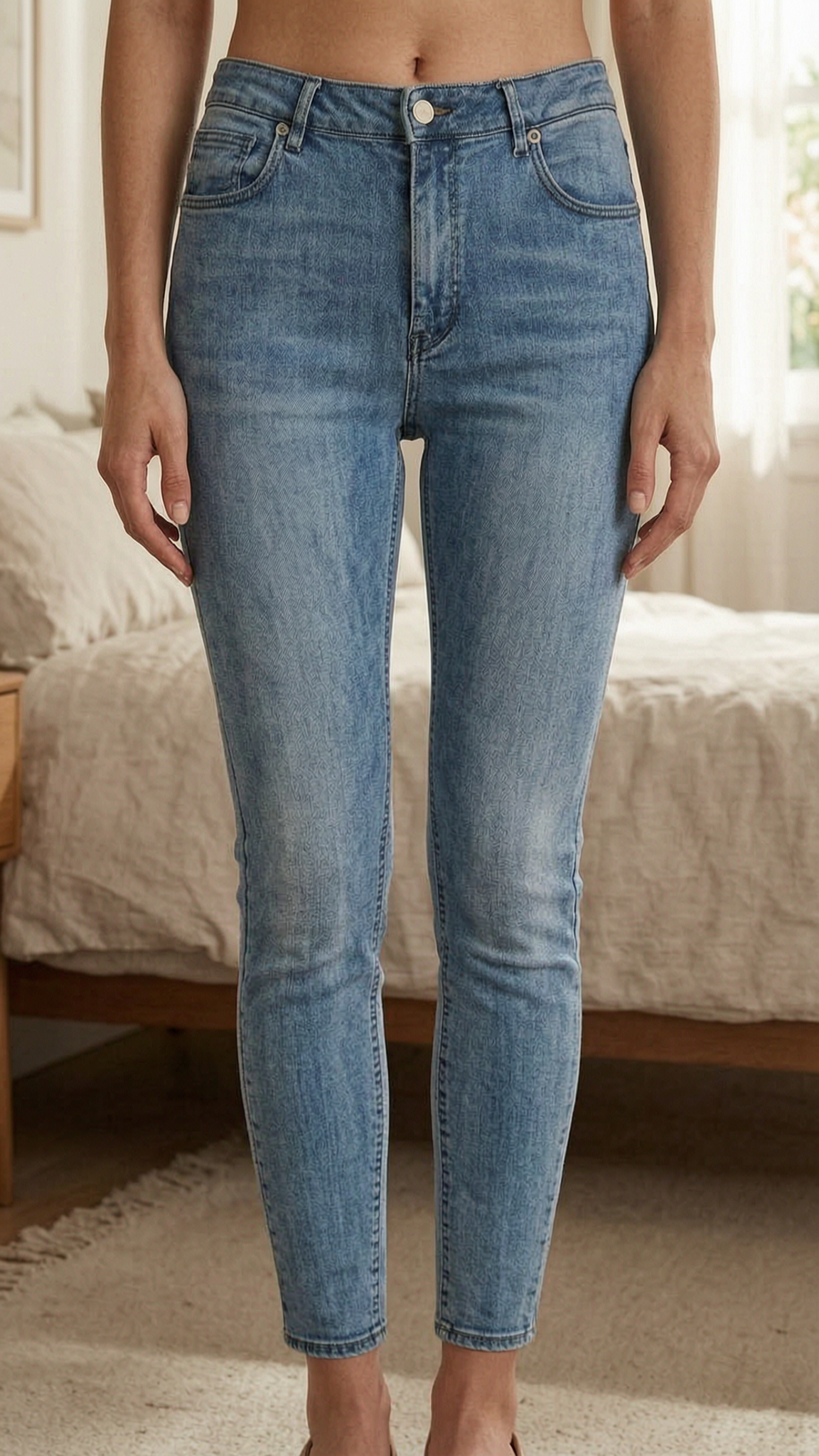 Jean Reiko debout, face à la caméra, dans une chambre à la lumière douce, avec une lumière naturelle filtrant par la fenêtre.