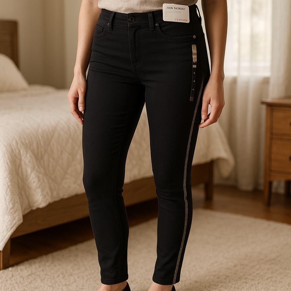 Jean's bande strass Camaïeu debout, face à la caméra, dans une chambre à la lumière douce, avec une lumière naturelle filtrant par la fenêtre.