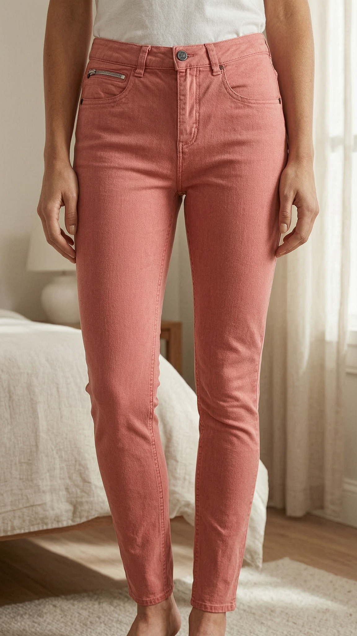 Jean toile Freeman T Porter debout, face à la caméra, dans une chambre à la lumière douce, avec une lumière naturelle filtrant par la fenêtre.