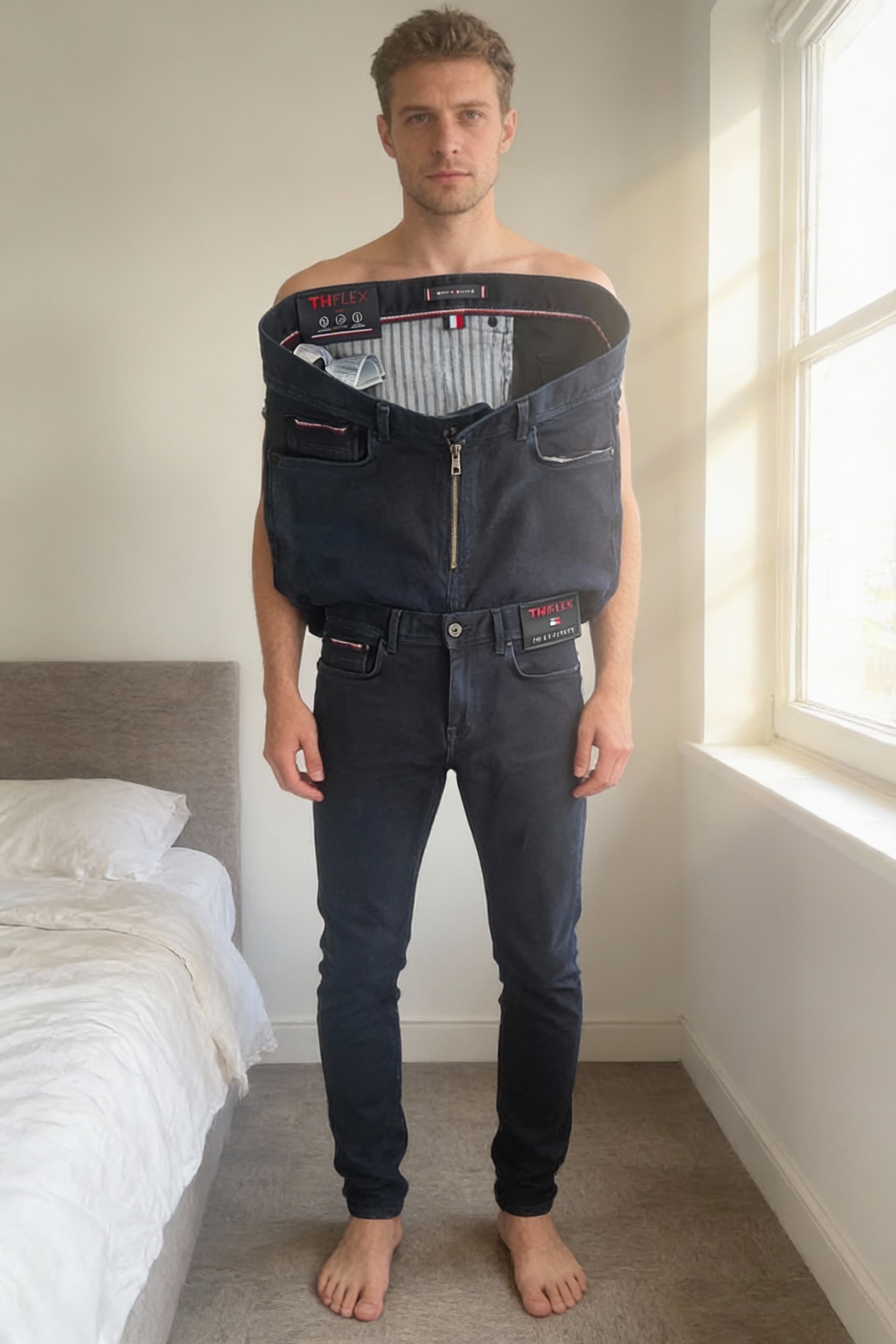 Jean tommy hilfiger W31L34 debout, face à la caméra, dans une chambre à la lumière douce, avec une lumière naturelle filtrant par la fenêtre.