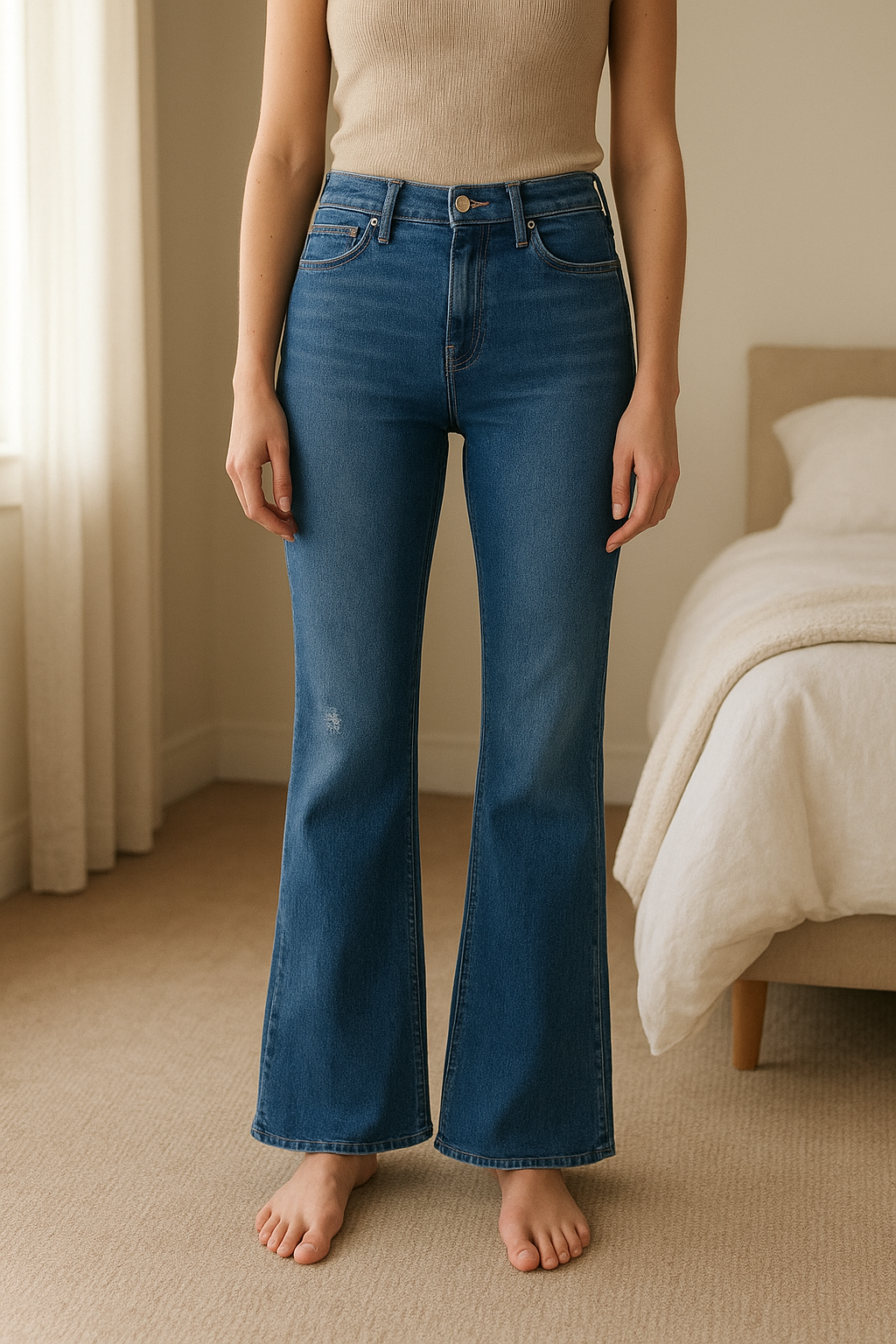 Jean Évasé Shein debout, face à la caméra, dans une chambre à la lumière douce, avec une lumière naturelle filtrant par la fenêtre.