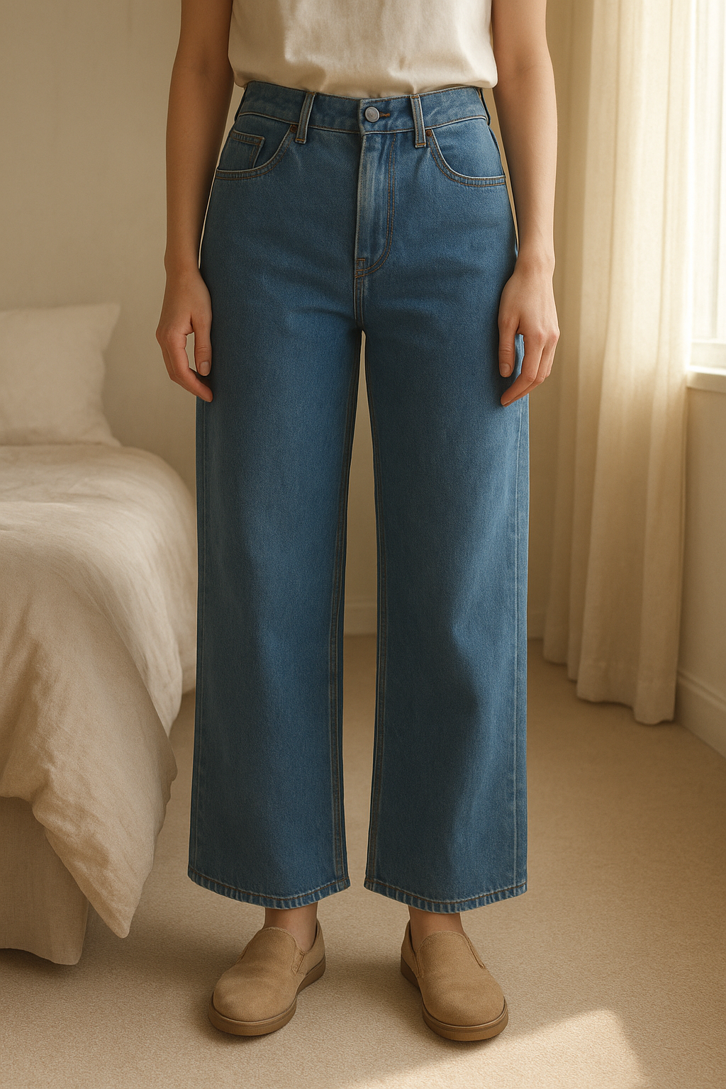 Jeans in piedi, rivolto verso la fotocamera, in una camera da letto con luce soffusa e luce naturale che filtra dalla finestra.