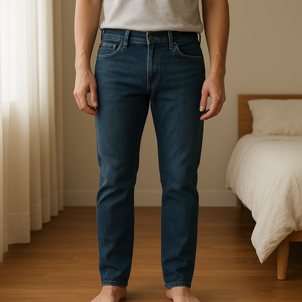 Jeans 720 super skinny Levi’s T27 (S) in piedi, rivolto verso la fotocamera, in una camera da letto con luce soffusa e luce naturale che filtra dalla finestra.