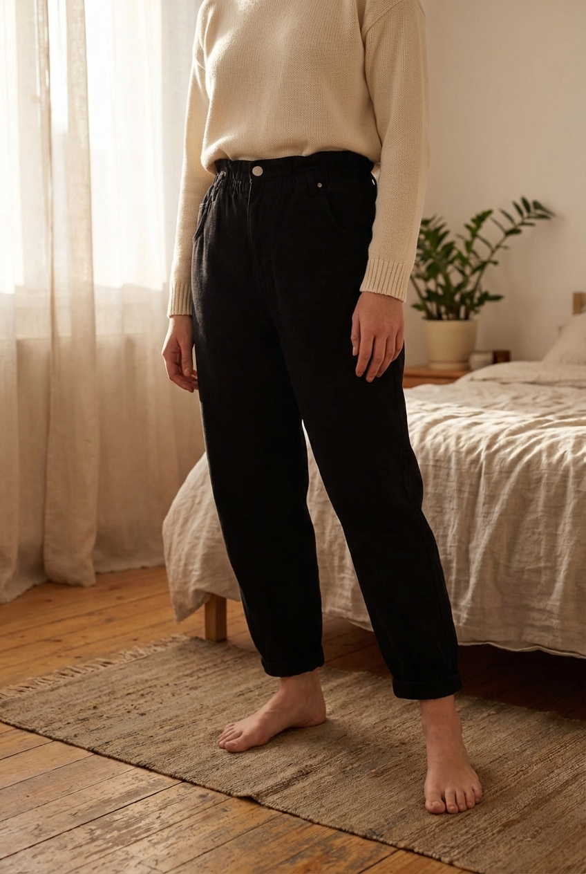 Jeans boyfriend Bershka 38 noir in piedi, rivolto verso la fotocamera, in una camera da letto con luce soffusa e luce naturale che filtra dalla finestra.