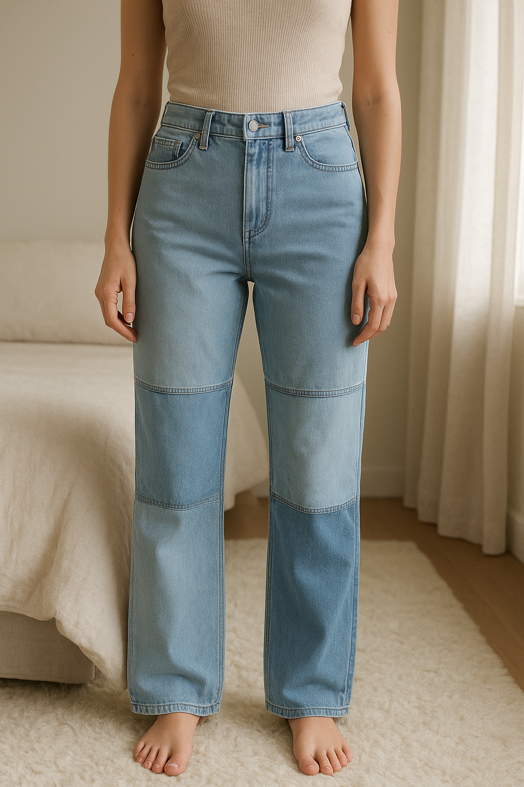 Jeans boyfriend Hollister California W25 in piedi, rivolto verso la fotocamera, in una camera da letto con luce soffusa e luce naturale che filtra dalla finestra.