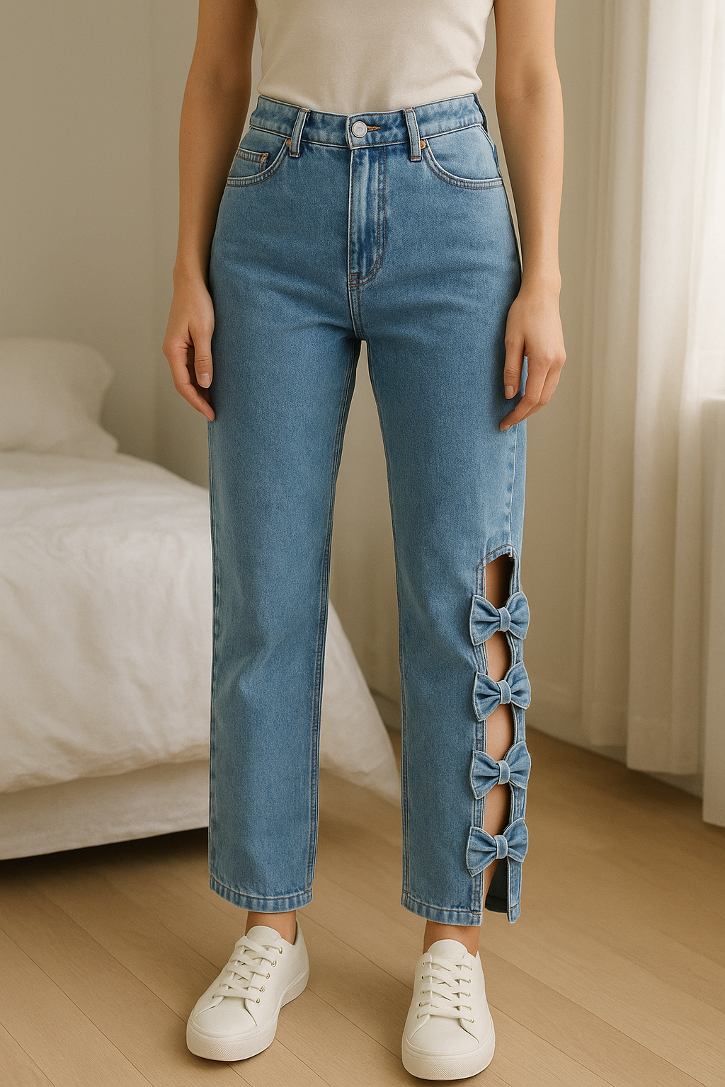 Jeans elastici con decorazioni sexy vintage y2k 🇺🇲 in piedi, rivolto verso la fotocamera, in una camera da letto con luce soffusa e luce naturale che filtra dalla finestra.