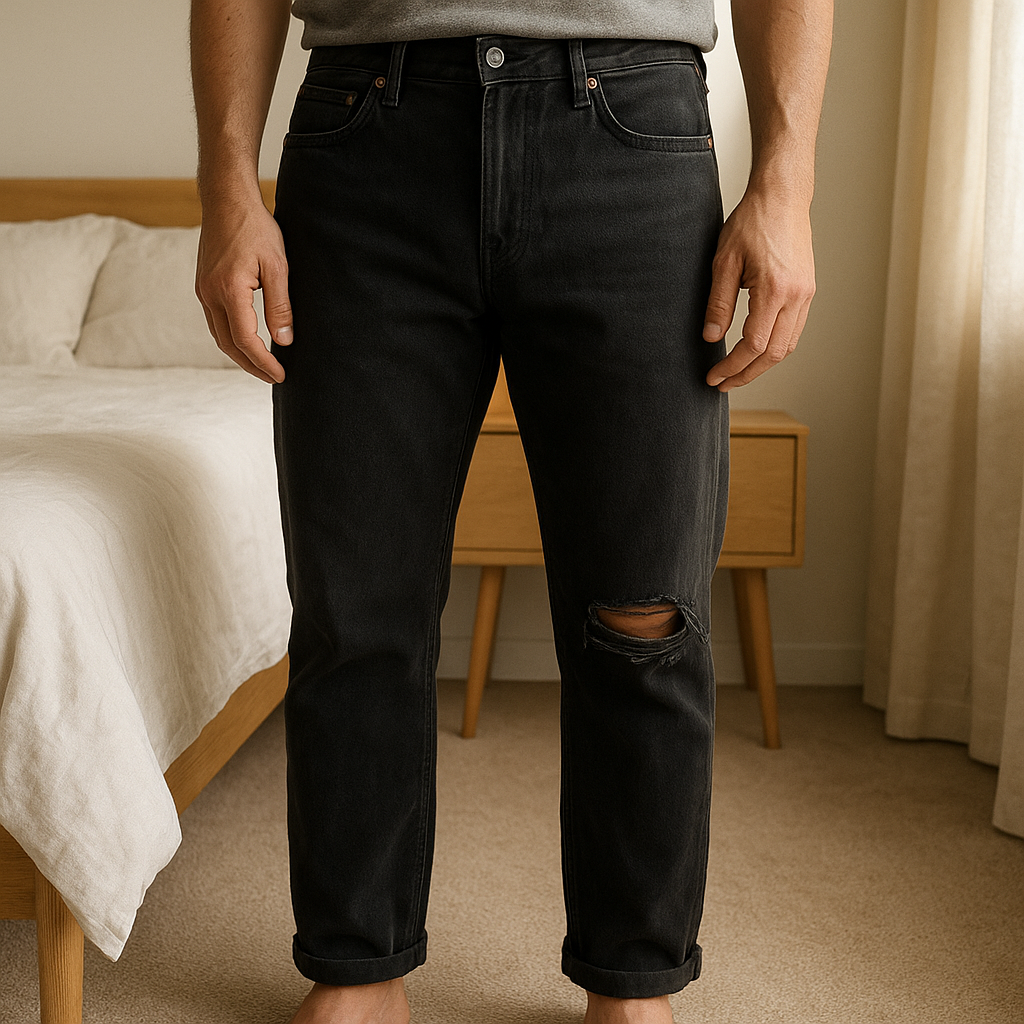 Jeans Gianni lupo tg 48 in piedi, rivolto verso la fotocamera, in una camera da letto con luce soffusa e luce naturale che filtra dalla finestra.