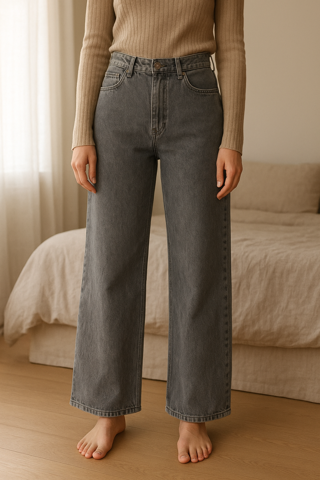 Jeans gris debout, face à la caméra, dans une chambre à la lumière douce, avec une lumière naturelle filtrant par la fenêtre.