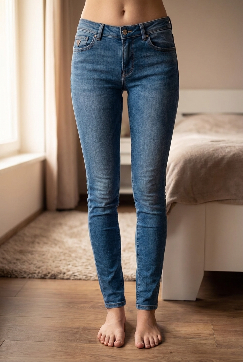 Jeans Guess T36 debout, face à la caméra, dans une chambre à la lumière douce, avec une lumière naturelle filtrant par la fenêtre.
