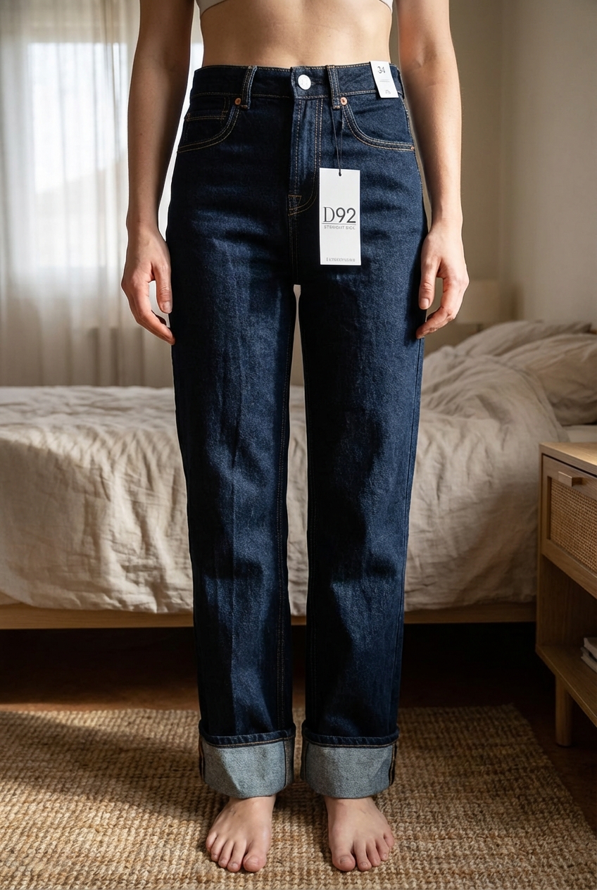Jeans long taille haute debout, face à la caméra, dans une chambre à la lumière douce, avec une lumière naturelle filtrant par la fenêtre.