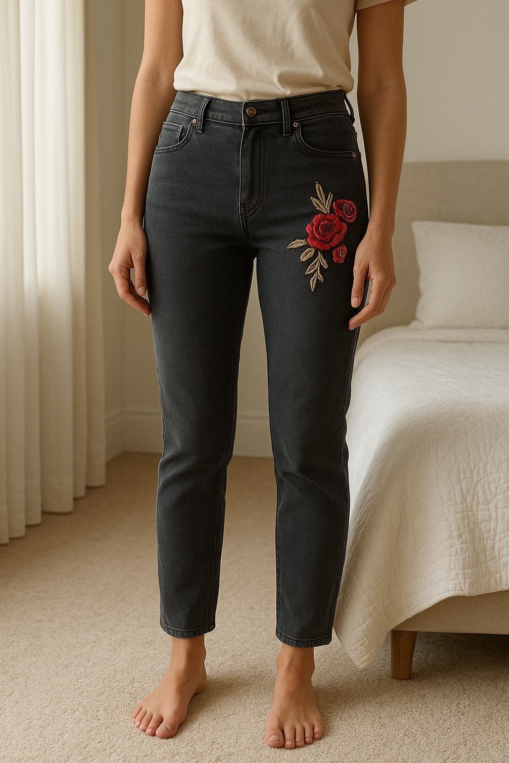 Jeans /marque Camaïeu /taille 42 debout, face à la caméra, dans une chambre à la lumière douce, avec une lumière naturelle filtrant par la fenêtre.